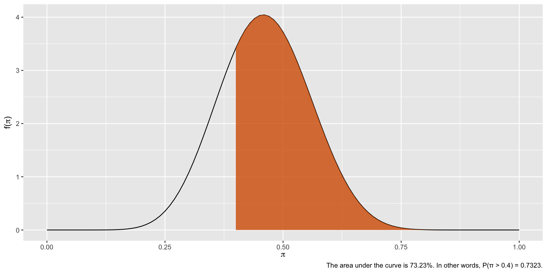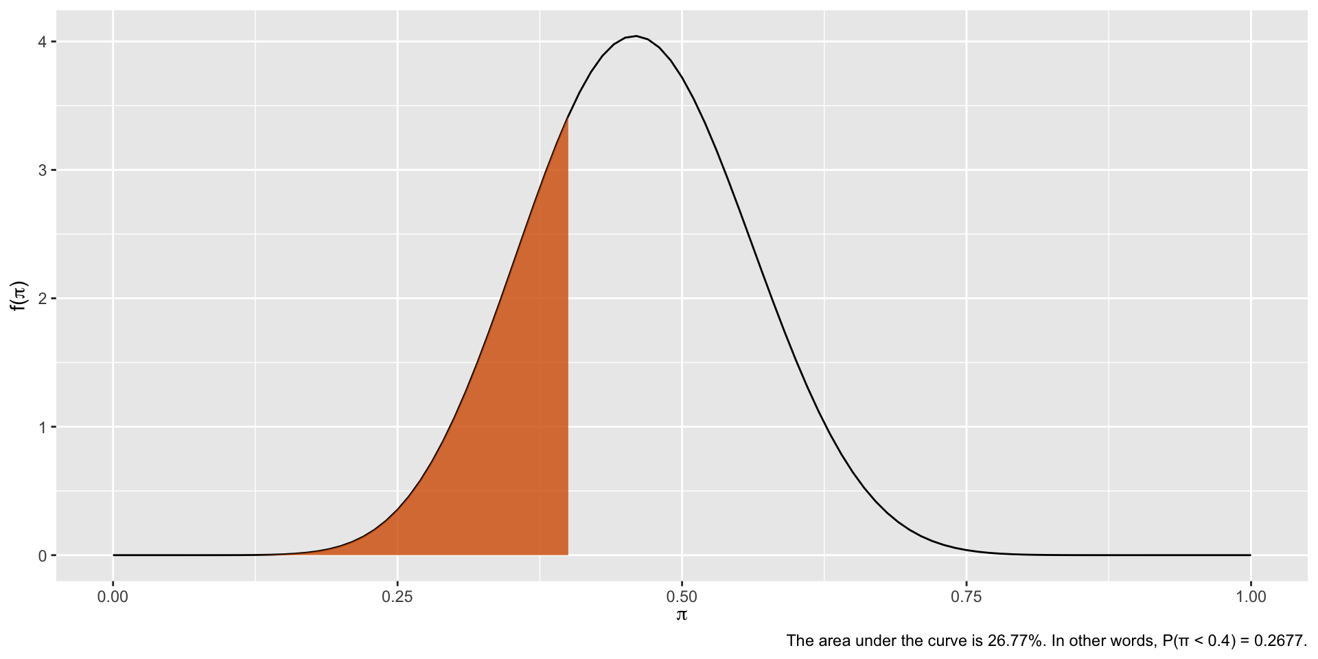 We have observed the scenario HTT, THT, or TTH in the sample. If \(\pi\) were to be 0.6 then probability of heads is 0.6 and probability of tails 0.4. Then probability of observing HTT is 0.6 \(\times\) 0.4 \(\times\) 0.4 = 0.096. The probability of observing THT is 0.4 \(\times\) 0.6 \(\times\) 0.4 = 0.096. Similarly, the probability of observing TTH is 0.4 \(\times\) 0.4 \(\times\) 0.6 = 0.096. Then likelihood of \(\pi\) being 0.6 is 0.096 \(+\) 0.096 \(+\) 0.096 = 0.288