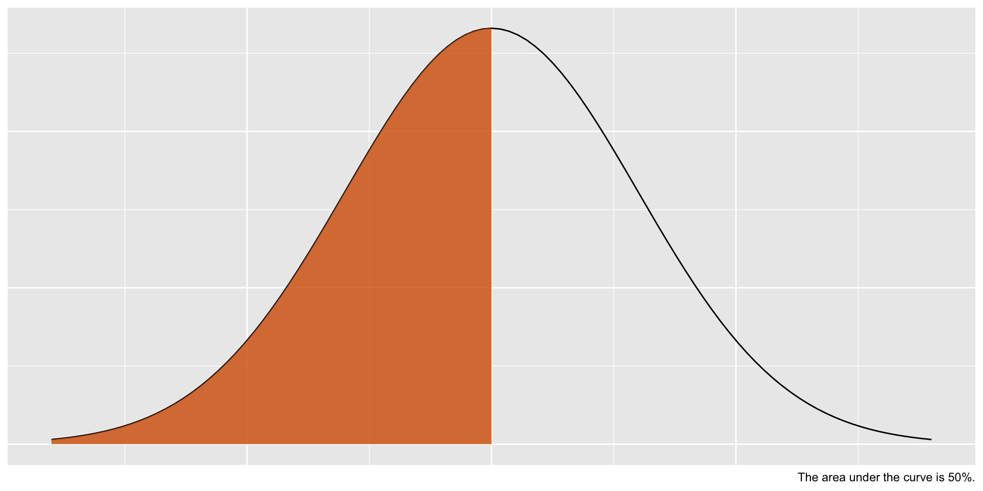 This is a symmetric distribution with mean, mode, and median falling exactly in the middle. The shaded region thus shows that the area under the curve is 50% indicating that if any data follows a normal distribution, we would expect 50% of the data to fall below the mean.