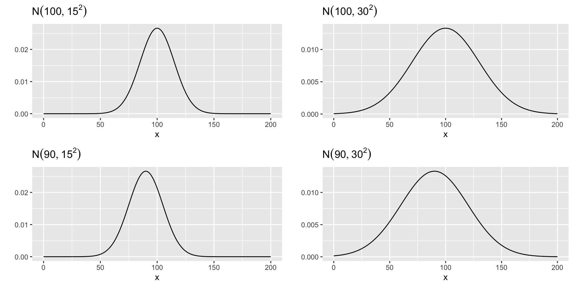 The shape of the distribution is controlled by two parameters: mean (\(\mu\)) and variance (\(\sigma^2\)). Using notation a normal distribution is shown as \(N(\mu, \sigma^2)\)