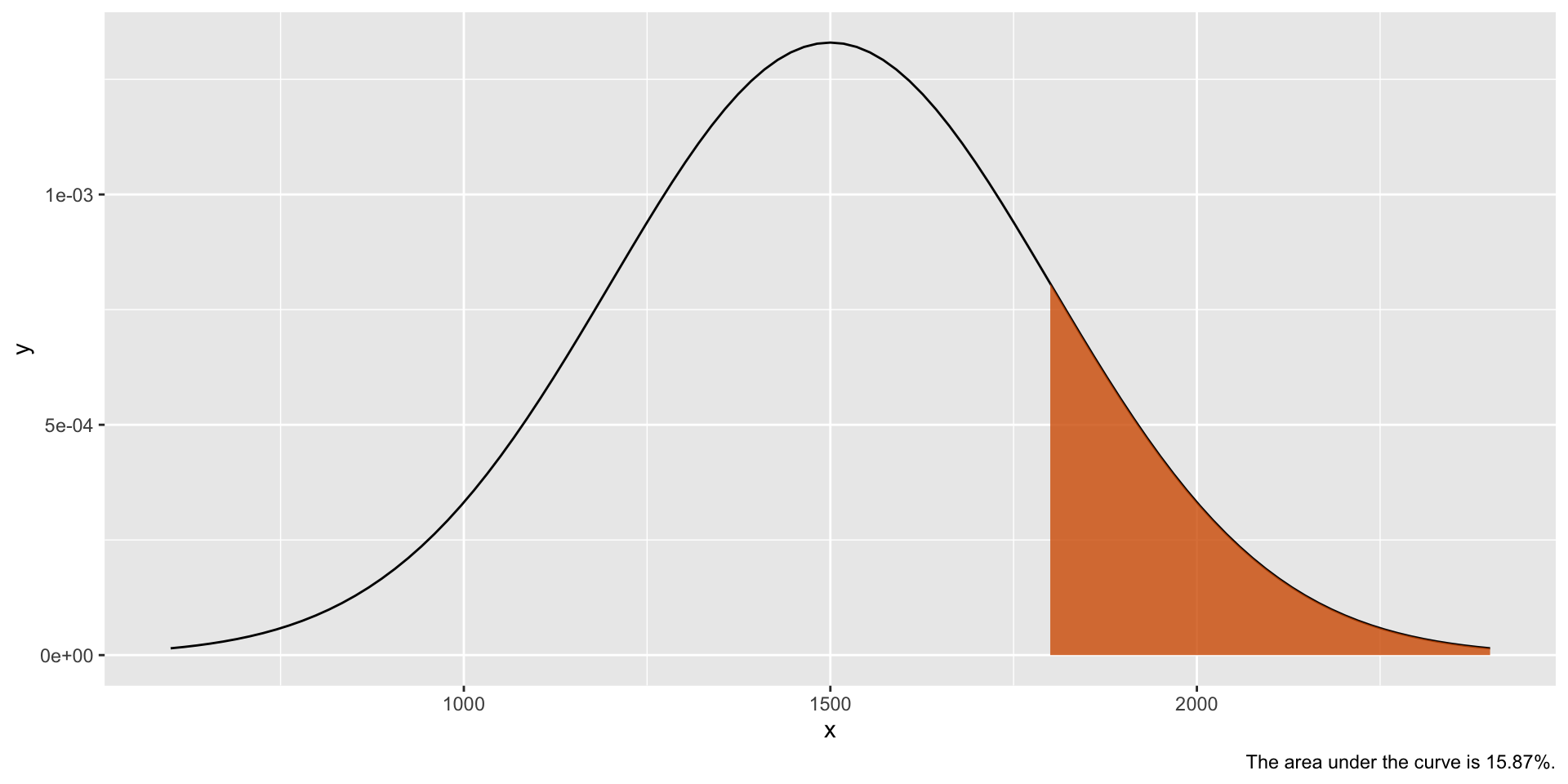 Let’s consider the SAT example again. SAT scores are normally distributed with a mean of 1500 and a standard deviation of 300. We can see in the previous figure that the area under the curve where SAT scores are greater than 1800 is 15.87 %. Thus the probability an SAT score being greater than 1800 is 0.1587.