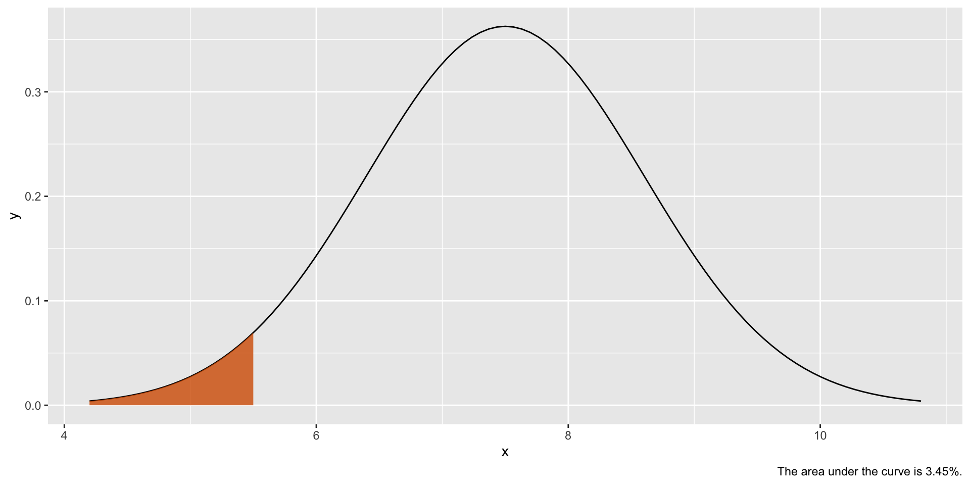 Birth weight of babies are known to be normally distributed with a mean of 7.5 pounds and a standard deviation of 1.1 pounds. If a baby is born less than 5.5 pounds then the baby is considered to be low weight. We can see in the previous plot that the probability a baby is born low weight is 0.0345.