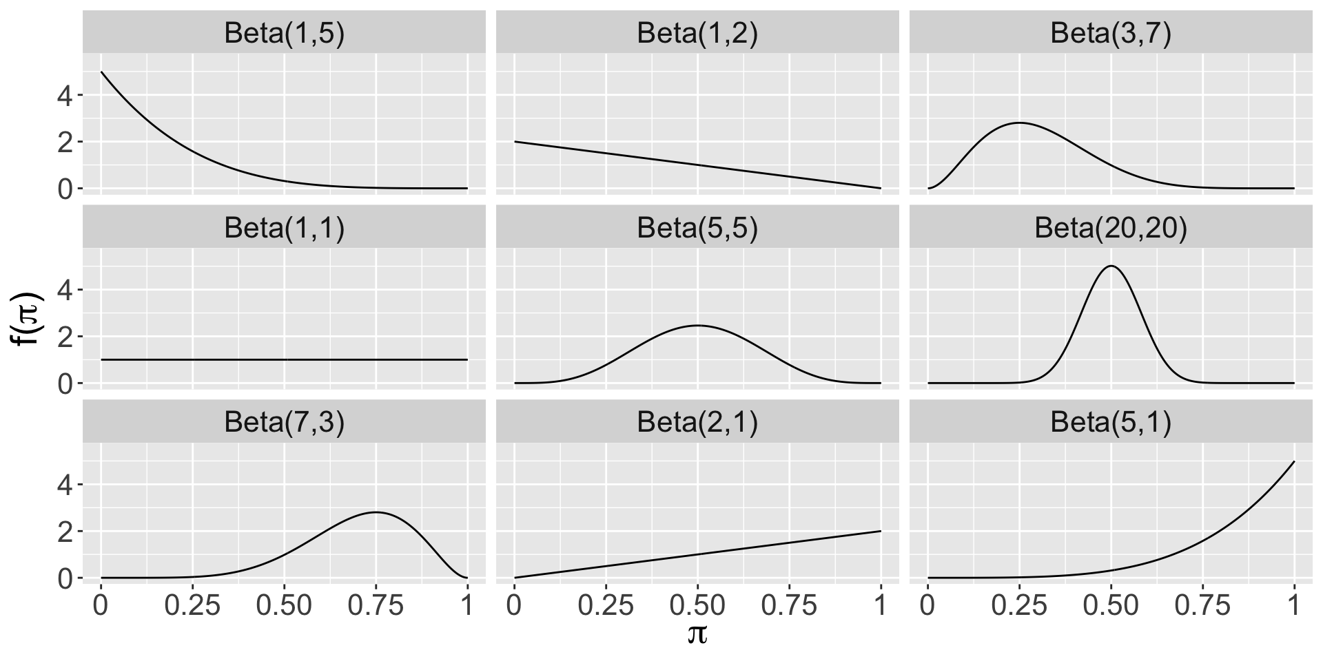 We use Beta distribution to model random variables that can take values 0 and 1. Next class we will use the Beta distribution to model the parameter \(\pi\). Beta distribution has two parameters \(\alpha\) and \(\beta\). Let random variable, \(\pi\) represent the proportion of bike owners on campus. The Beta distribution takes two shape parameters as \(\alpha\) and \(\beta\).
